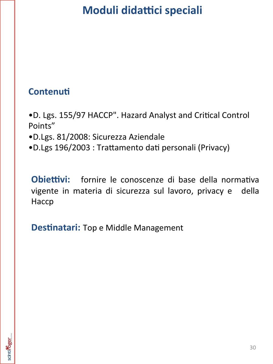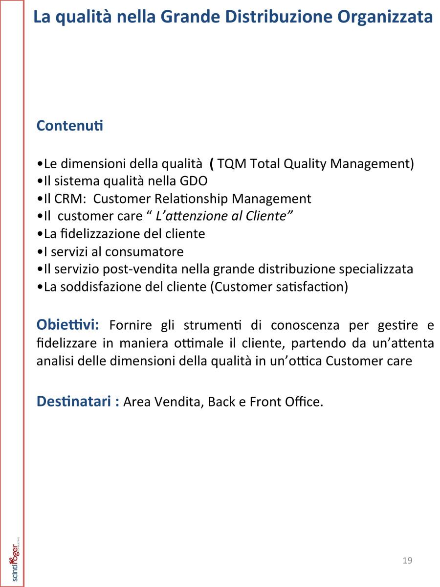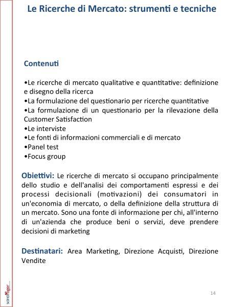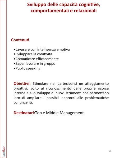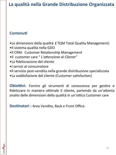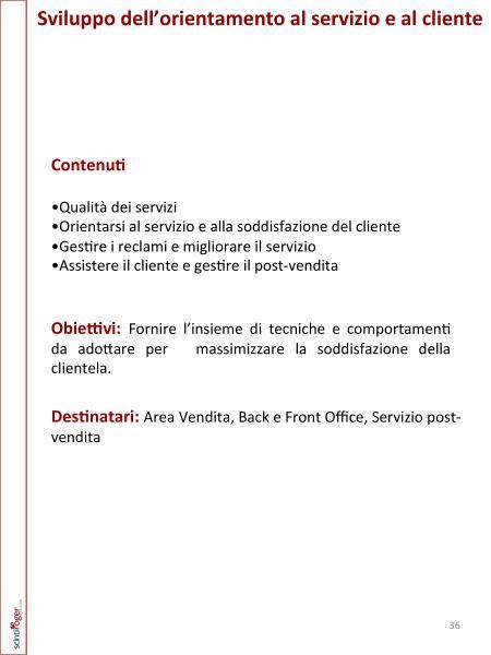 La nostra offerta formativa tende a superare il concetto di corso di formazione statico per quello più ampio di azione formativa globale, individualizzata e flessibile che determina “qualità, specializzazione e alta professionalità”, partendo sempre da un’analisi puntuale della cultura, della Mission e della Vision dell’Azienda committente e dalle esigenze specifiche.
